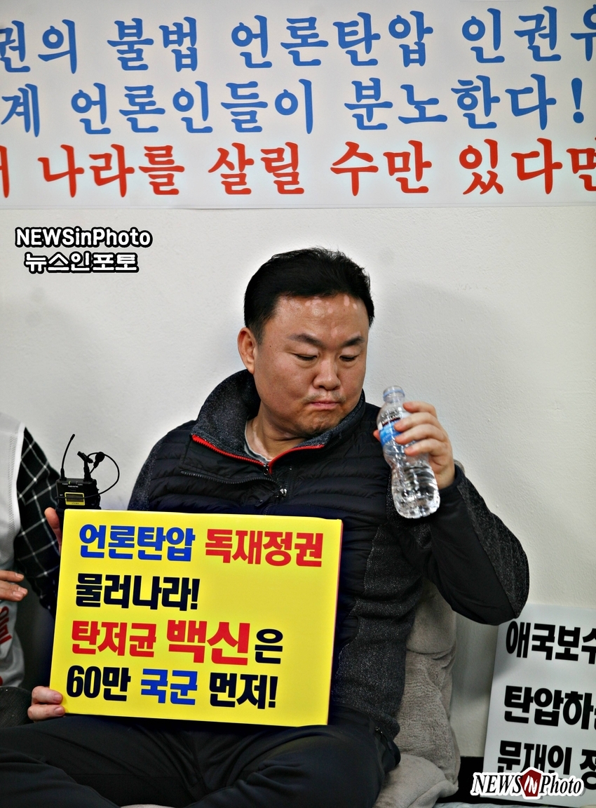 2일 오전 10시 경찰의 출석요구를 앞두고 1일 밤 뉴스타운 단식 농성장에는 부당한 출석요구에 분개한 시민들과 유투브 중계 관계자들이 현장을 찾아와 손 회장을 격려하는 모습이 보였다.