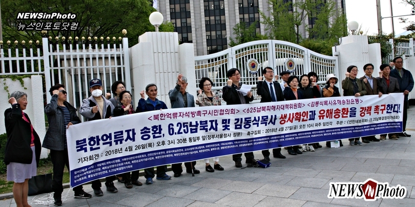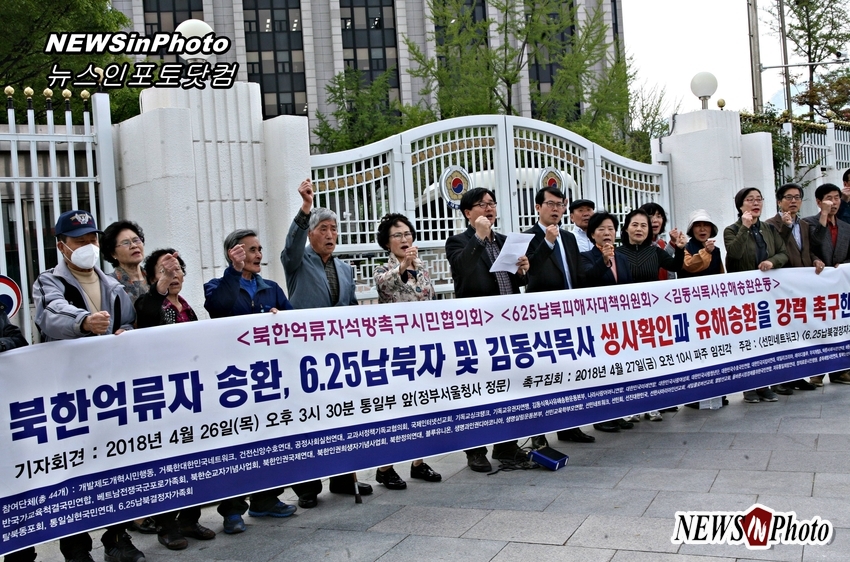 북한 억류 선교사 10명 석방 ,625납북자 김동식목사 생사확인 및 유해송환 촉구 기자회견이 광화문 통일부앞{정부성울청사}에서 북한억류자석방촉구시민협의회, 625납북피해자대책위원회, 김동식목사유해송환운동과 선민네트워크, 6.25납북결정자가족회 주관으로 진행 되었다