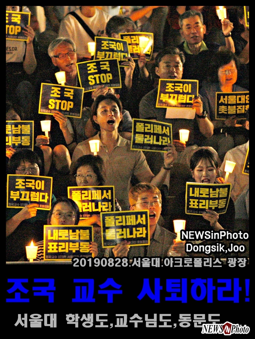 지난 28일 서울대학교총학생회는 “조국 교수 OUT! , 제2차 서울대인 촛불집회”를 서울대 관악 캠퍼스 아크로폴리스 광장에서 800여 명의 서울대생,교수,졸업생 동문들이 참여한 가운데 조국 교수와 그의 딸의 논문과 지정장학금 수여에 대한 비판을 분노로 나타내다.