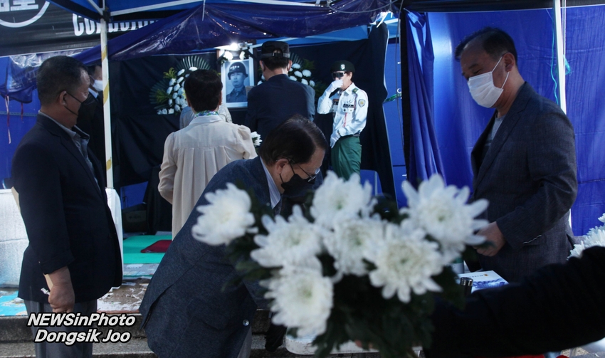 그러나 코로나 바이러스 열체크하는 텐트에서 50여M 이어지는 대기열에도 십여 명의 조문시민들이 분향을 위해 기다리는 모습을 보일 뿐 봉사자들보다 적은 수의 시민들로 한가한 모습을 보였다.
