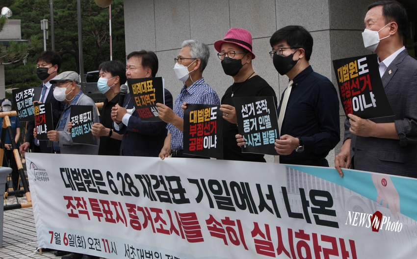 4.15부정선거국민투쟁본부(대표 민경욱, 이하’국투본’) 및 제 연대단체는 6일 오전 11시 서초구 대법원 앞에서 기자회견을 개최하고, 6.28 재검표에서 드러난 선거 조작, 증거 인멸에 대한 수사권 발동을 요청하고, 조작 투표지 물증이 포착되므로 4.15 부정선거 진실규명과 선거 정상화를 위한 본격적인 투쟁의 막을 힘차게 올렸다.
