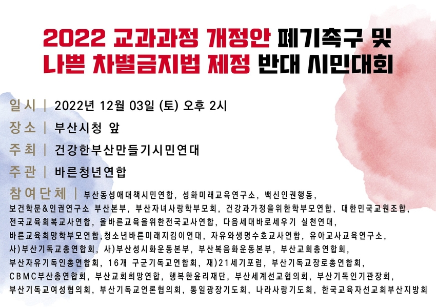 2022 개정 교육과정 폐기 촉구 및 나쁜 차별금지법 제정 반대 부산시민대회가 건강한부산만들기시민연대 상임대표 안용운 목사의 개회 선언으로 12월 3일 오후 2시 부산시청광장에서 진행 되었다. 건강한부산만들기시민연대(이하, ‘연대’, 대표 안용운 목사)가 주최한 이날 집회에는 바른청년연합(대표 손영광) 등 35개의 부산시민단체가 참가하는 등 약 5,000여명의 부산 시민들이 모였다.