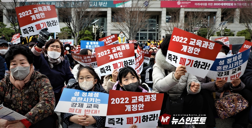부산시민들과 단체들은 “성 정체성 혼란시키는 강제교육 절대 반대”,“ 2022 교육과정 개정안 즉각 폐기하라”라는 문구의 손피켓을 들고 2022 교육과정 개정안에 대해 반대 목소리를 높였다.