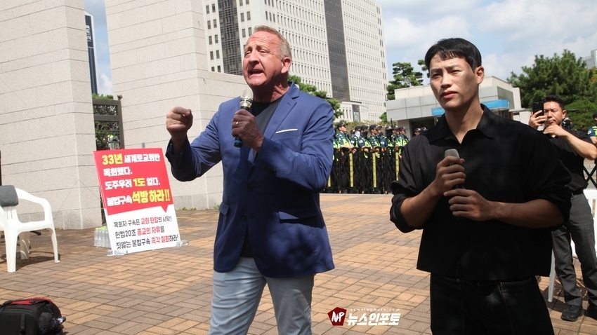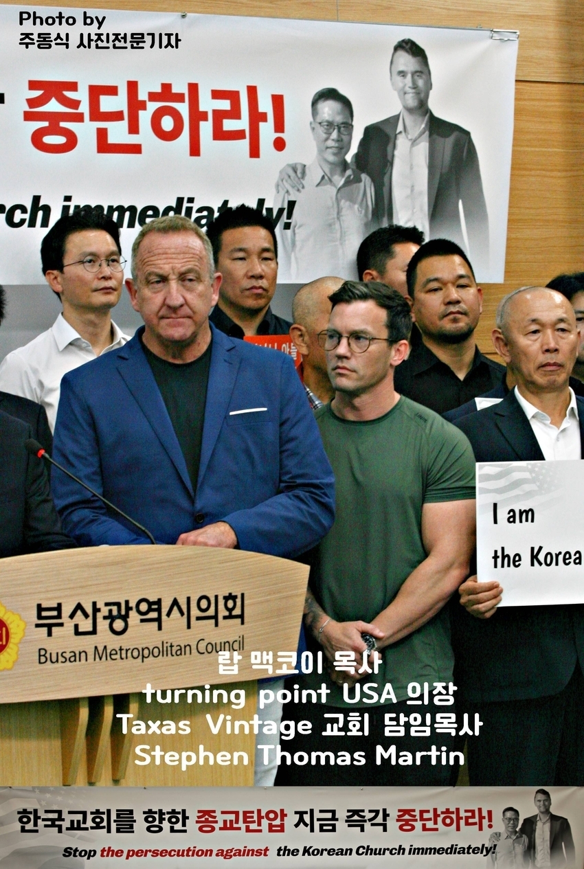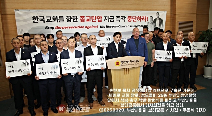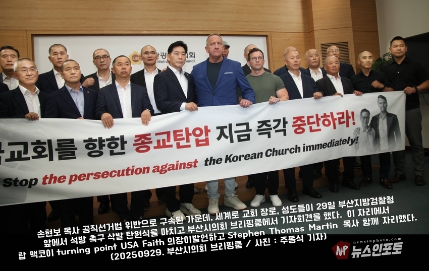 [뉴스인포토닷컴 주동식 기자] 손현보 목사 석방 삭발 탄원식 세계로교회 장로 성도 17명 참여, 구속적부심 재판장 김도균 부장판사 규탄, '이완용' 언급, 손현보 목사 목회활동 반민족적 극우적인 행위 규정,.밥 맥코이 목사 turning point USA는 한국교회와 함께 싸울 것!, 기독교인들 다 들으십시요!진실은 거짓에 대해 두려워하지 않습니다 진실있는 곳에 거짓이 있을 수 없습니다,.거짓에 대해 싸워야 합니다.우리는 폭력을 말하는게 아닙니다.ㅡㅡㅡㅡㅡ20250929. 부산지방검찰청 앞.세계로교회 삭발 탄원식 진행.ㅡㅡㅡㅡㅡ글.사진 주동식 사진전문기자. 독립언론 뉴스인포토닷컴 대표. ㅡㅡㅡㅡㅡㅡㅡㅡㅡㅡㅡㅡㅡㅡㅡㅡㅡㅡㅡㅡㅡㅡㅡㅡㅡㅡㅡㅡㅡㅡㅡㅡㅡㅡ 손현보 목사 석방을 위한 삭발 탄원식이 지난달 9월 29일 월요일 12시 부산지방검찰청 앞에서 진행되었다. 세계로교회 장로 성도 등 17명이 삭발식에 참여했고, 탄원식에는 세계로 교회 성도 및 시민들이 참석한 가운데 이날 오전 부산 구치소에서 손현보 목사를 면회한 turning point USA Faith 의장인 랍 맥코이 목사도 메시지를 전했다.랍 맥코이 목사는 전날 세계로 교회 주일예배에서도 설교를 했다. 이날