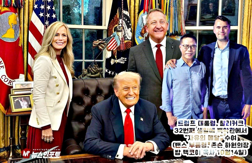 도널드 트럼프 미국 대통령, 사망한 찰리 커크 32살 생일에 유가족 초대해 민간인 최고의 영예 “자유의 메달” (Presidential Medal of Freedom)수여, 랍 맥코이 의장 (turning point USA) 참석, 한국의 종교탄압, 손현보 목사 구속, 핍박 등 한국의 상황을 백악관에 전달, JD 밴스 부통령, 마이크 존슨 하원의장 배석. ㅡㅡㅡㅡㅡ20251014. 미국 백악관, 트럼프 대통령 찰리 커크 “자유의 메달” 수여식. ㅡㅡㅡㅡㅡ20251019. 독립언론, 뉴스인포토닷컴. 글.사진.정리 = 주동식 사진전문기자. 뉴스인포토 대표. 미국 도널드 트럼프 대통령은 지난 10월 14일, 사망한 찰리 커크(Charlie Kirk) 의 32번째 생일에 맞춰 미국 민간인에게 수여되는 최고 영예의 “자유의 메달” (Presidential Medal of Freedom)을 수여하고 찰리 커크의 유산을 이어갈 것이라고 강조했다. 이 자리에는 찰리 커크 유가족, JD 밴스 부통령, 마이크 존슨 하원의장, 그리고 찰리 커크 멘토였고 turning point USA 의장 랍 맥코이 목사(Rob McCoy), 백악관 관계자들이 참석했다. "랍 맥코이 목사님은