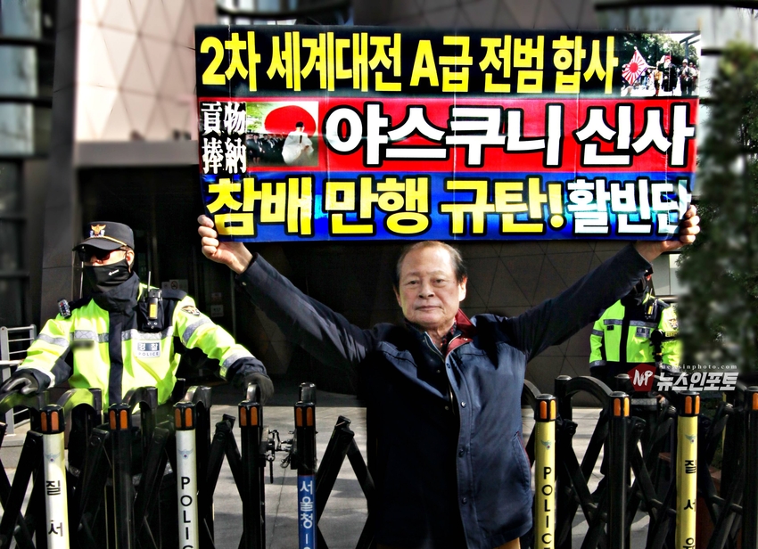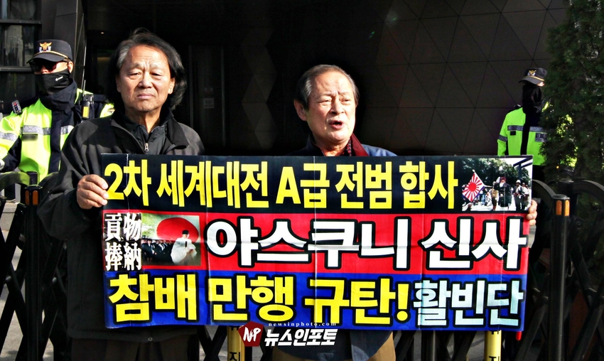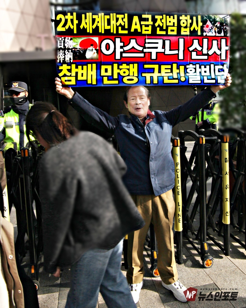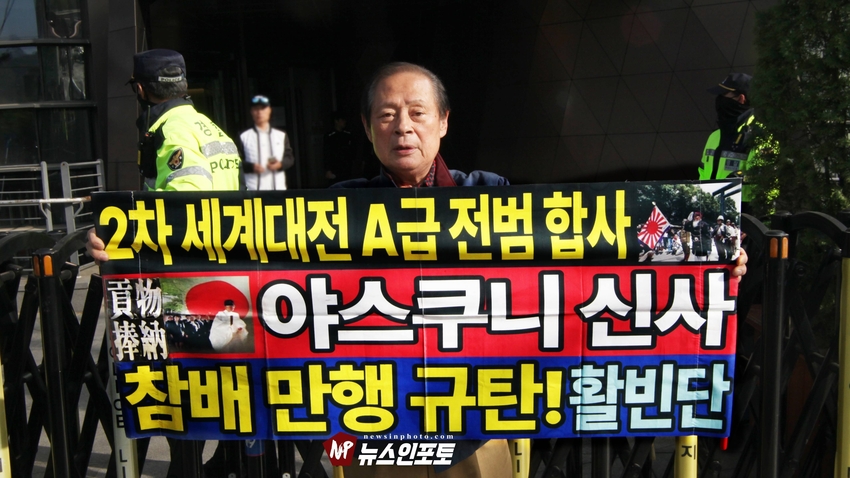다카이치 사나에(高市早苗) 일본 총리가 22일 야스쿠니 춘계 예대제에서 공물 봉납한 사실이 알려지고, 야스쿠니 신사에 참배하는 국회의원 126명 소식이 알려지자 시민단체 활빈단은 22일 오후 4시30분 경 종로구 율곡로에 있는 일본대사관 입구 트윈트리타워A동 입구에서 비판 성명서를 발표했다.