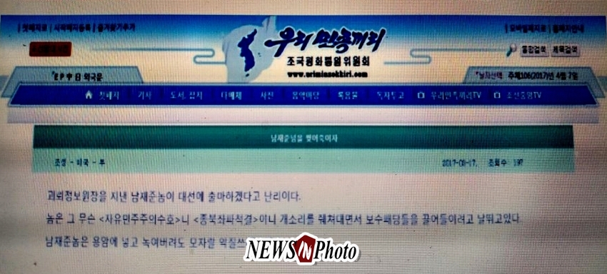 우리민족끼리는 ‘남재준넘을 찢어죽이자’란 게시물을 통해 “괴뢰정보원장을 지낸 남재준놈이 대선에 출마하겠다고 난리이다. 놈은 그 무슨 <자유민주주의수호>니 <종북좌파척결>이니 개소리를 줴쳐대면서 보수매당들을 끌어들이려고 날뛰고 있다. 남재준놈은 용암에 넣고 녹여버려도 모자랄 악질쓰레기이다.”라고 주장했다.