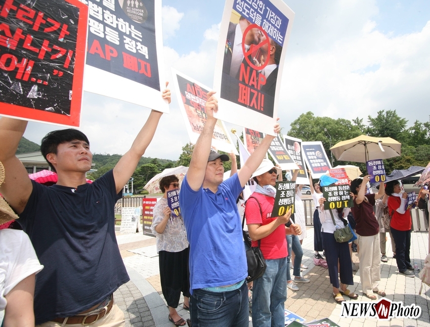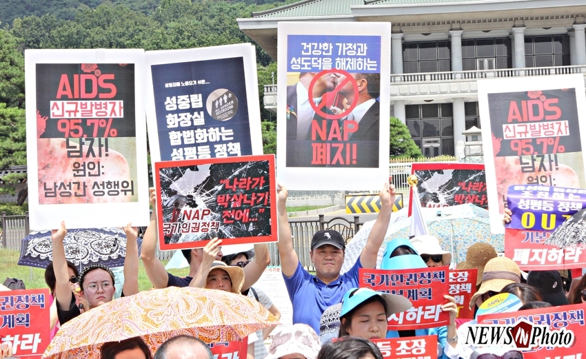 동성애 옹호 조장하는,위헌 위법 제3차 국가인권정책 기본계획{이하,기본계획} 폐기 촉구 집회가 국무회의 통과를 하루 앞둔 6일 오후에도 동성애동성혼반대국민연합 주최로 청와대 분수대 앞에서 진행되어 남성목회자 6명,여성 목회자 2명이 삭발 투쟁에 참여했다.