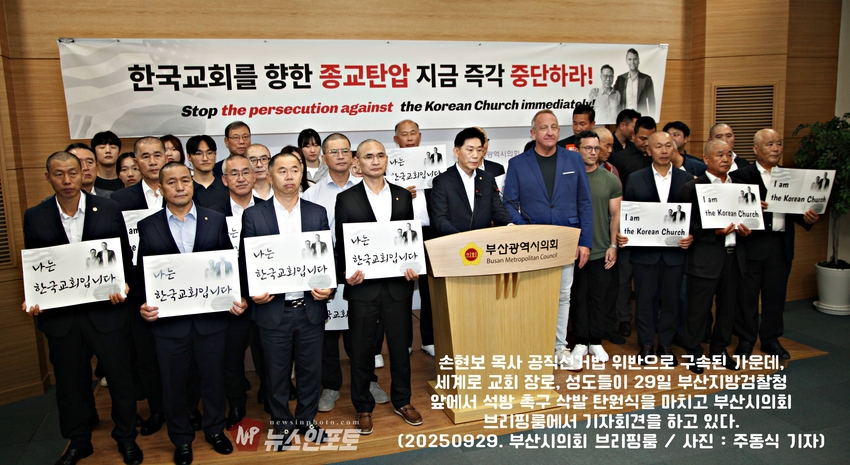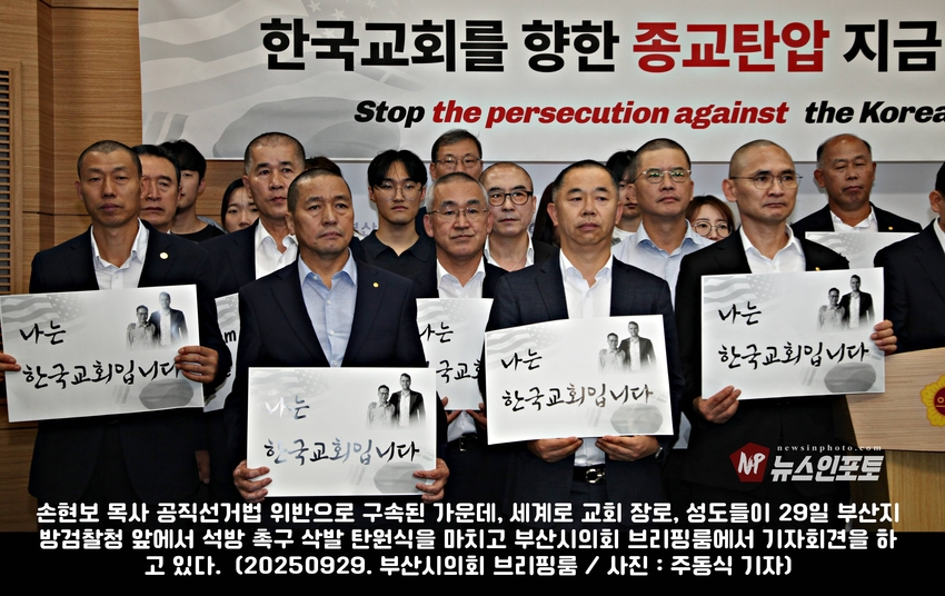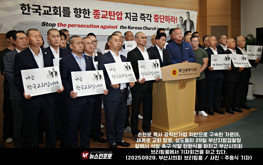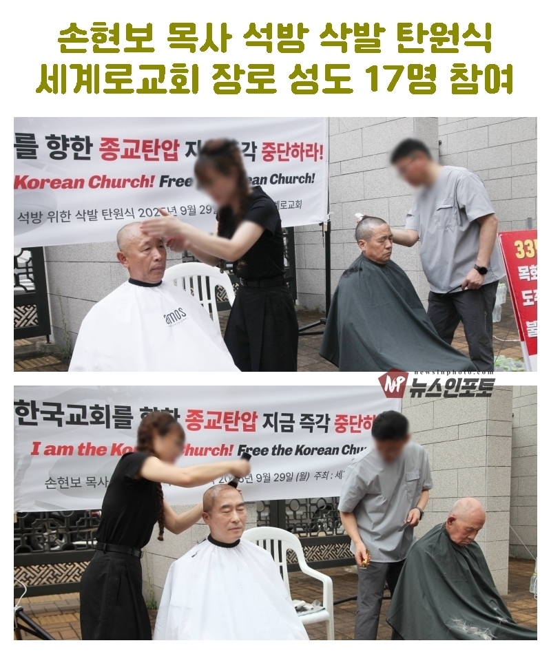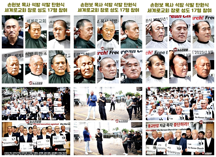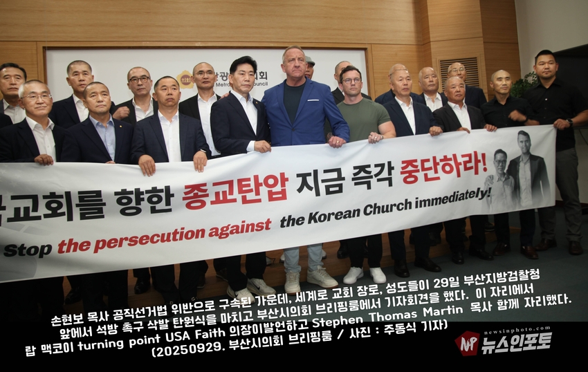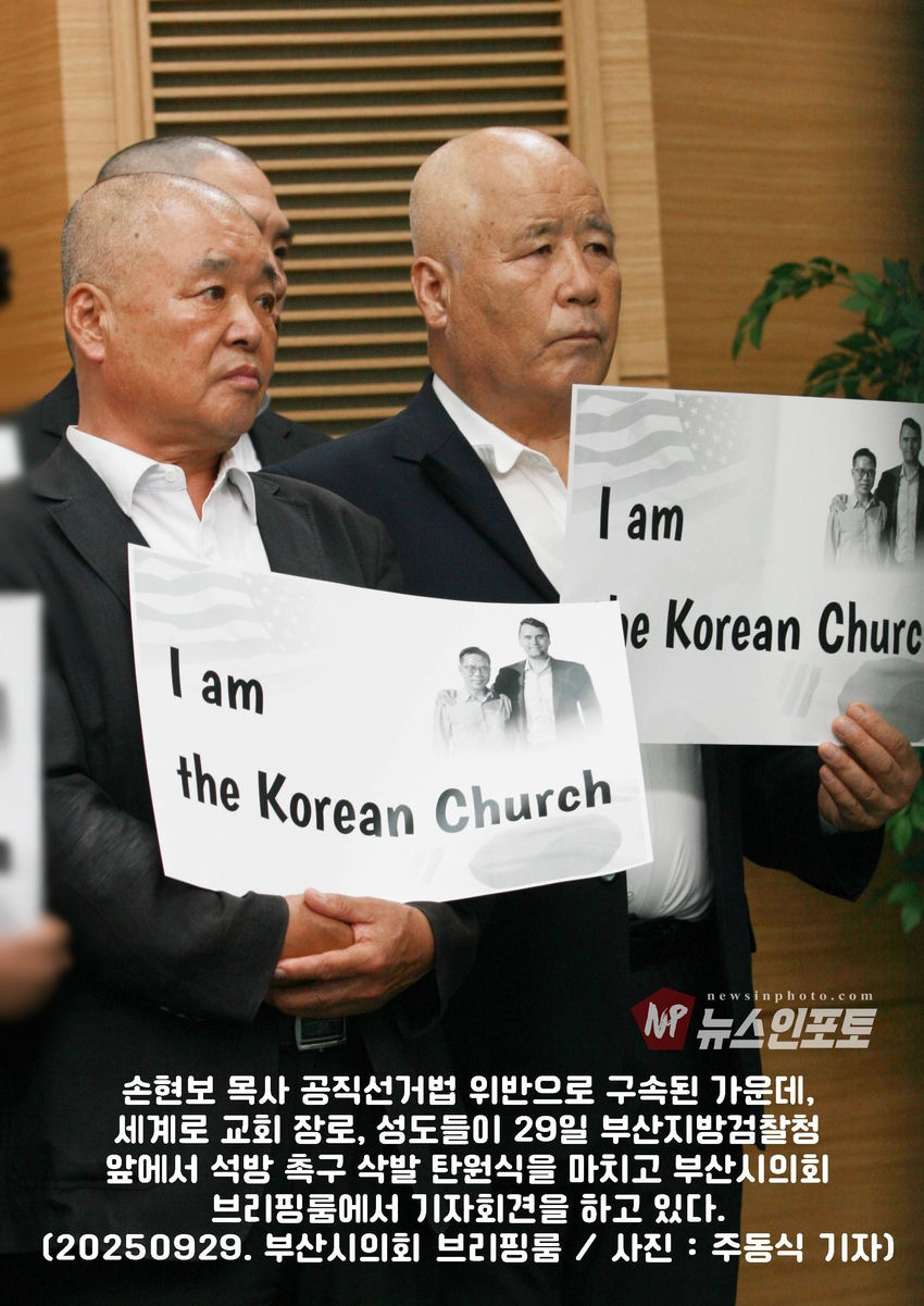 [뉴스인포토닷컴 주동식 기자] 손현보 목사 석방 삭발 탄원식 세계로교회 장로 성도 17명 참여, 구속적부심 재판장 김도균 부장판사 규탄, '이완용' 언급, 손현보 목사 목회활동 반민족적 극우적인 행위 규정,.밥 맥코이 목사 turning point USA는 한국교회와 함께 싸울 것!, 기독교인들 다 들으십시요!진실은 거짓에 대해 두려워하지 않습니다 진실있는 곳에 거짓이 있을 수 없습니다,.기짓에 대해 싸워야 합니다.우리는 폭력을 말하는게 아닙니다.ㅡㅡㅡㅡㅡ20250929. 부산지방검찰청 앞.세계로교회 삭발 탄원식 진행.ㅡㅡㅡㅡㅡ글.사진 주동식 사진전문기자. 독립언론 뉴스인포토닷컴 대표. ㅡㅡㅡㅡㅡㅡㅡㅡㅡㅡㅡㅡㅡㅡㅡㅡㅡㅡㅡㅡㅡㅡㅡㅡㅡㅡㅡㅡㅡㅡㅡㅡㅡㅡ 손현보 목사 석방을 위한 삭발 탄원식이 지난달 9월 29일 월요일 12시 부산지방검찰청 앞에서 진행되었다. 세계로교회 장로 성도 등 17명이 삭발식에 참여했고, 탄원식에는 세계로 교회 성도 및 시민들이 참석한 가운데 이날 오전 부산 구치소에서 손현보 목사를 면회한 turning point USA Faith 의장인 랍 맥코이 목사도 메시지를 전했다.랍 맥코이 목사는 전날 세계로 교회 주일예배에서도 설교를 했다. 이날