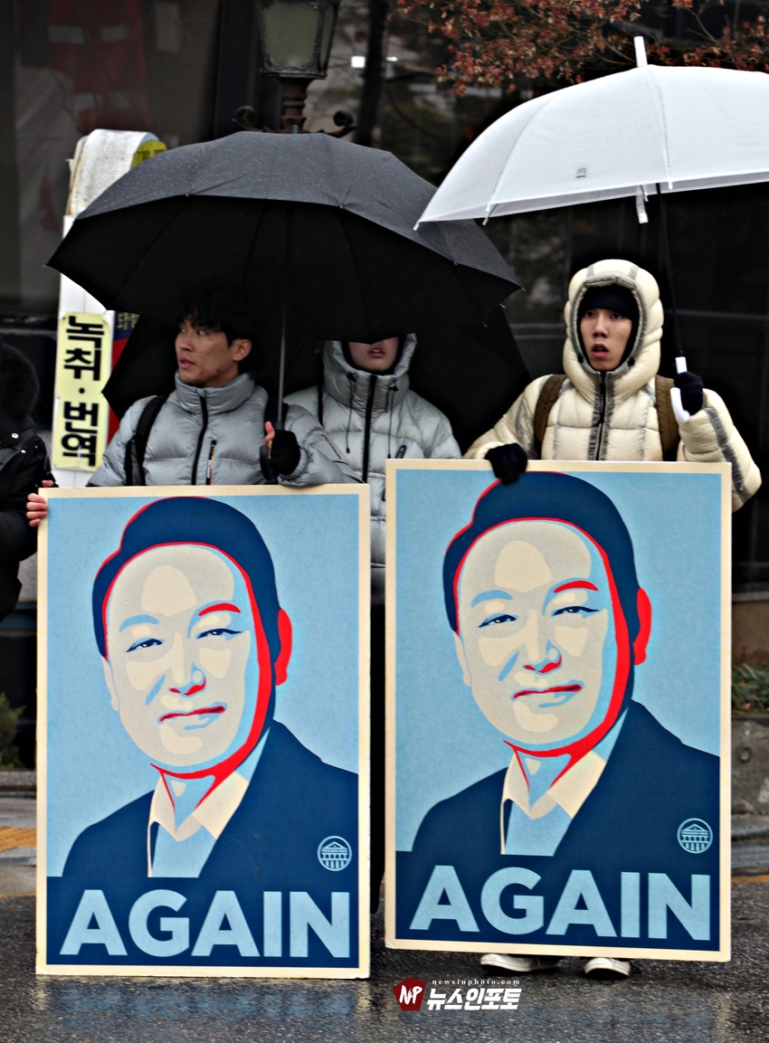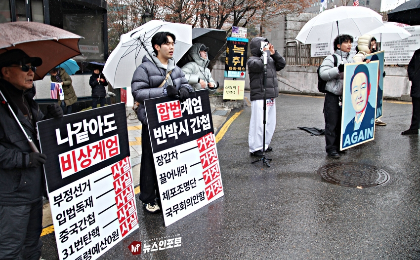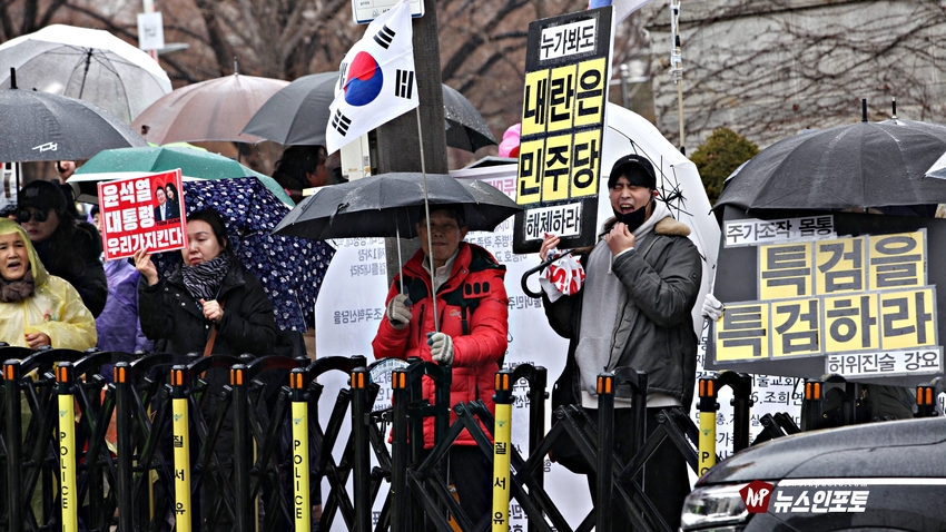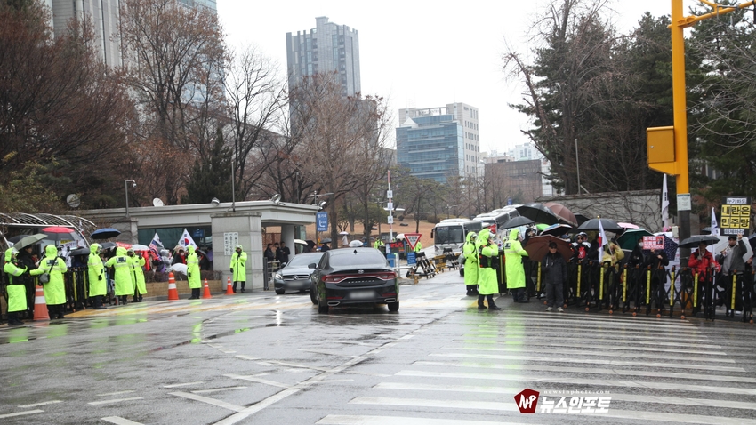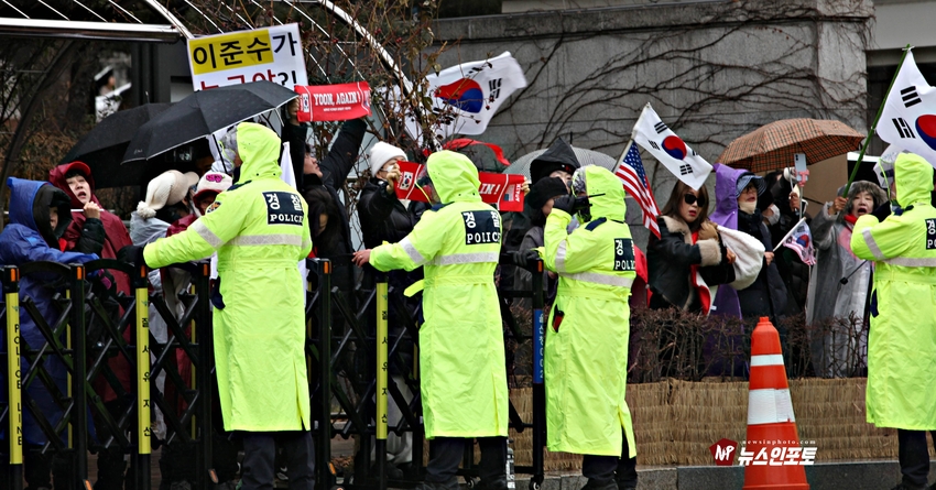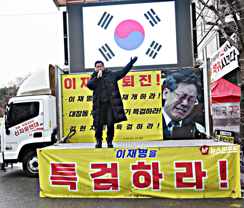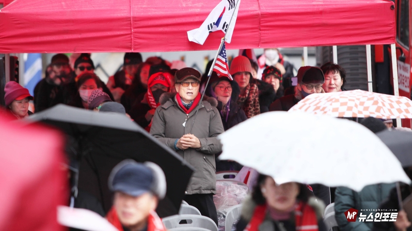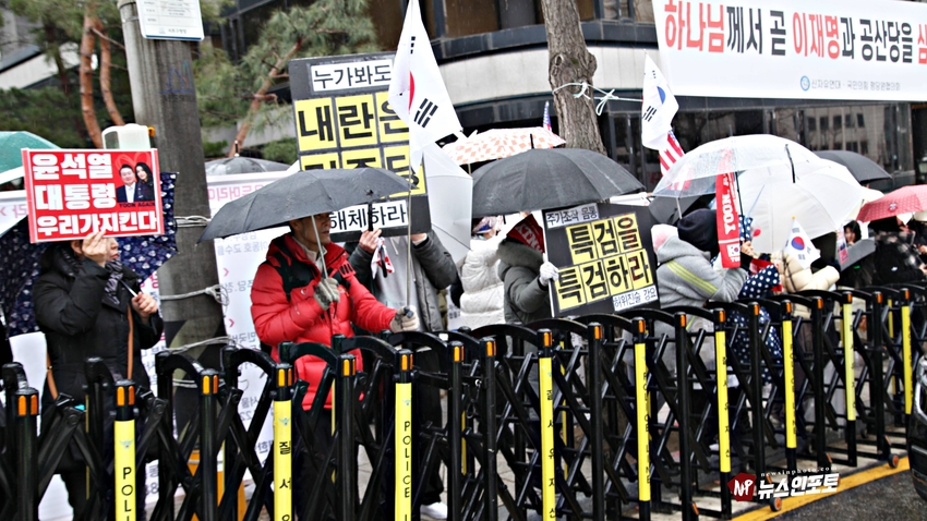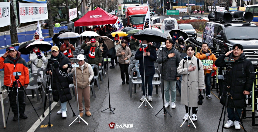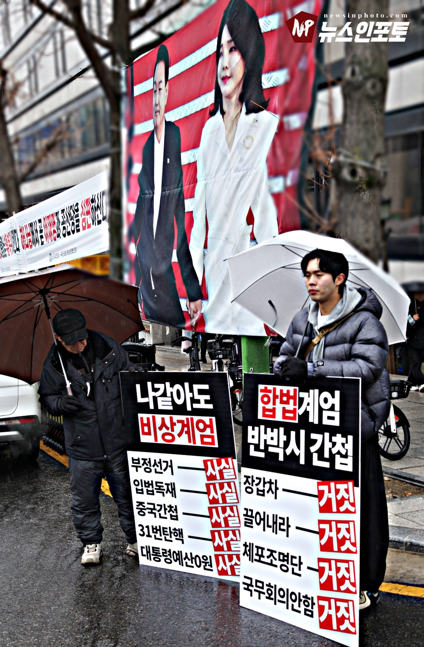 [뉴스인포토닷컴]북한의 오물 풍선, 무인기 남한내 투입 대응은 윤석열 전 대통령 고유 통치 행위!. 윤 전 대통령 추가 구속 심문 서울중앙지법 23일 진행, 윤 전 대통령 추가 구속 절대 반대!특검, 영장 기각, 불법 수사 반대!. 특검? 평양 무인기 투입 혐의, 12.3 비상 계엄 명분 쌓기, 추가 꼼수 기소.!ㅡㅡㅡㅡㅡㅡㅡㅡㅡㅡㅡㅡ20251223. 서초동 서울중앙지법. 신자유연대 (김상진 대표) 현장 집회. ㅡㅡㅡㅡㅡㅡㅡㅡ(뉴스인포토닷컴 / 글.사진 = 주동식 사진전문기자) 12.3 비상계엄 명분 쌓기 의혹, 평양에 무인기 투입 혐의로 특검에 의해 추가 기소된 윤 전 대통령의 구속 심문이 23일 오후 2시 30분 경 서울중앙지법 형사합의 36부에 의해 진행 되었다. 윤 전 대통령 변호인 측은 북한이 남한 땅에 오물 풍선, 무인기 투입등으로 촉발된 점으로 볼 때, 이것은 대통령 고유의 통치행위라고 보고 있는데 반해 특검은 비상계엄 선포 명분 쌓기 위해 북한에 무인기 보냈다는 입장으로 추가 구속 입장을 주장하고 있다. 비와 눈이 함께 내리는 23일 오후 윤 어게인을 외치는 시민단체 신자유연대는 서초동 정곡빌딩 남측 도로에 집회 차량을 세우고 짧게 국민의례를