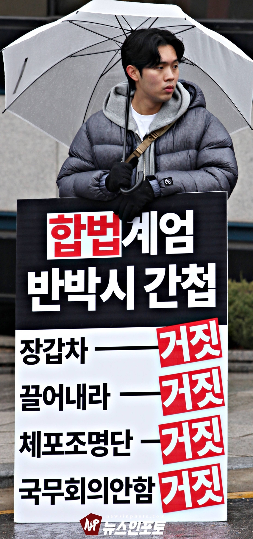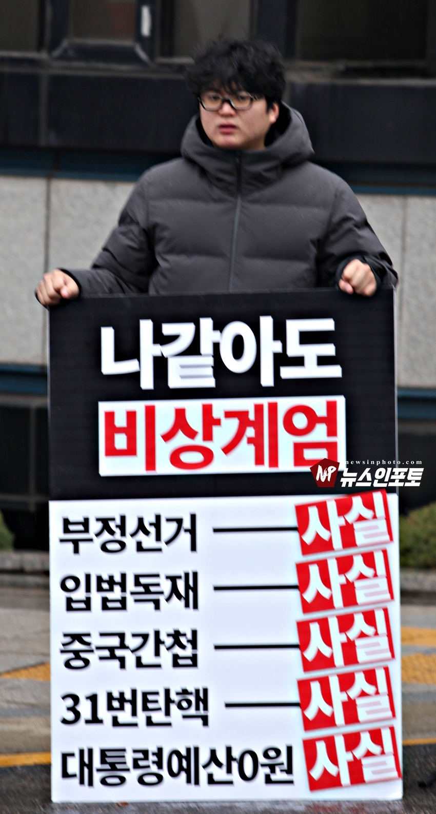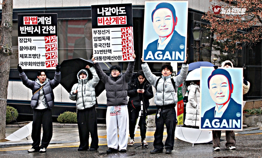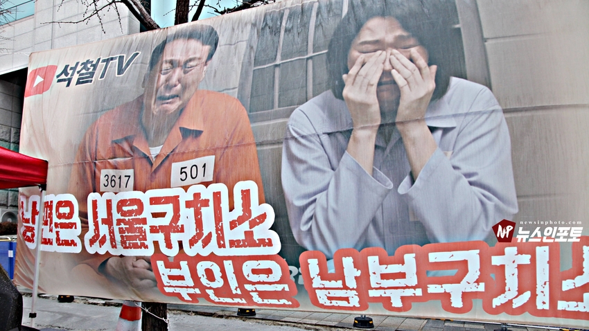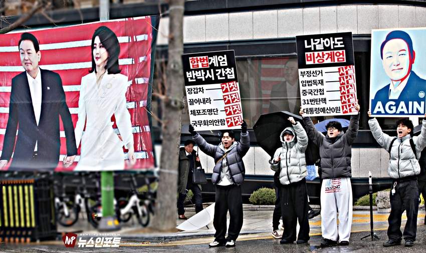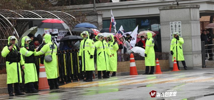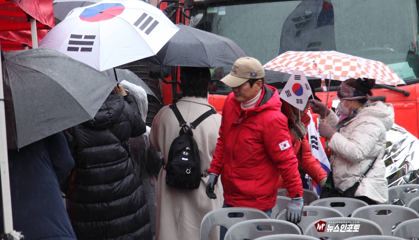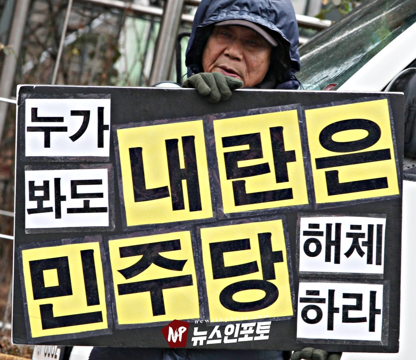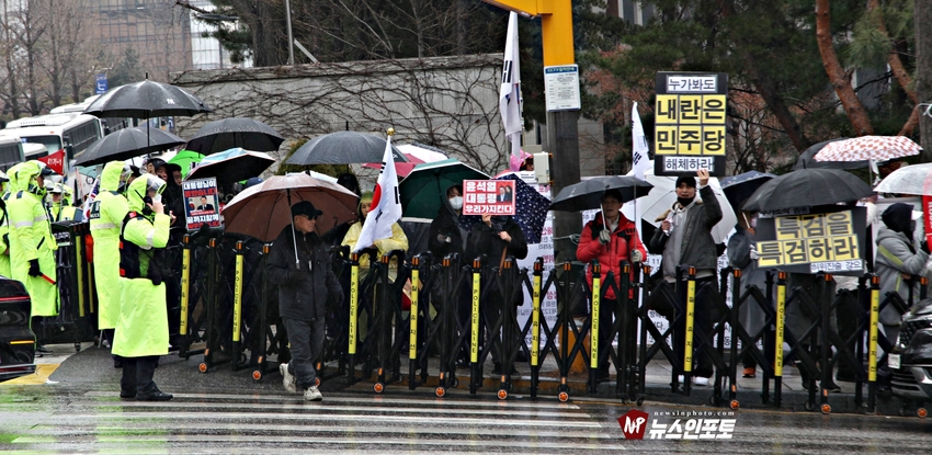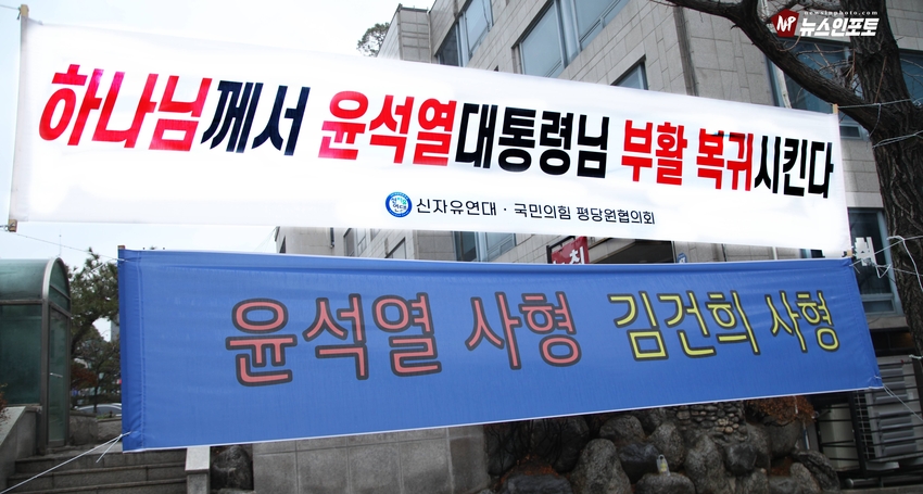 [뉴스인포토닷컴]북한의 오물 풍선, 무인기 남한내 투입 대응은 윤석열 전 대통령 고유 통치 행위!. 윤 전 대통령 추가 구속 심문 서울중앙지법 23일 진행, 윤 전 대통령 추가 구속 절대 반대!특검, 영장 기각, 불법 수사 반대!. 특검? 평양 무인기 투입 혐의, 12.3 비상 계엄 명분 쌓기, 추가 꼼수 기소.!ㅡㅡㅡㅡㅡㅡㅡㅡㅡㅡㅡㅡ20251223. 서초동 서울중앙지법. 신자유연대 (김상진 대표) 현장 집회. ㅡㅡㅡㅡㅡㅡㅡㅡ(뉴스인포토닷컴 / 글.사진 = 주동식 사진전문기자) 12.3 비상계엄 명분 쌓기 의혹, 평양에 무인기 투입 혐의로 특검에 의해 추가 기소된 윤 전 대통령의 구속 심문이 23일 오후 2시 30분 경 서울중앙지법 형사합의 36부에 의해 진행 되었다. 윤 전 대통령 변호인 측은 북한이 남한 땅에 오물 풍선, 무인기 투입등으로 촉발된 점으로 볼 때, 이것은 대통령 고유의 통치행위라고 보고 있는데 반해 특검은 비상계엄 선포 명분 쌓기 위해 북한에 무인기 보냈다는 입장으로 추가 구속 입장을 주장하고 있다. 비와 눈이 함께 내리는 23일 오후 윤 어게인을 외치는 시민단체 신자유연대는 서초동 정곡빌딩 남측 도로에 집회 차량을 세우고 짧게 국민의례를