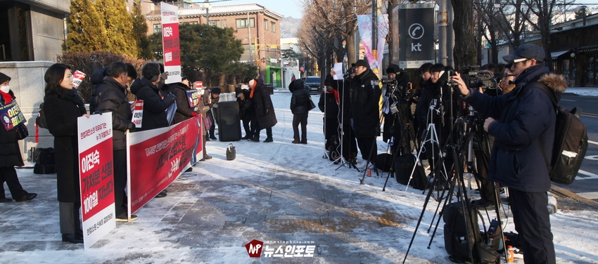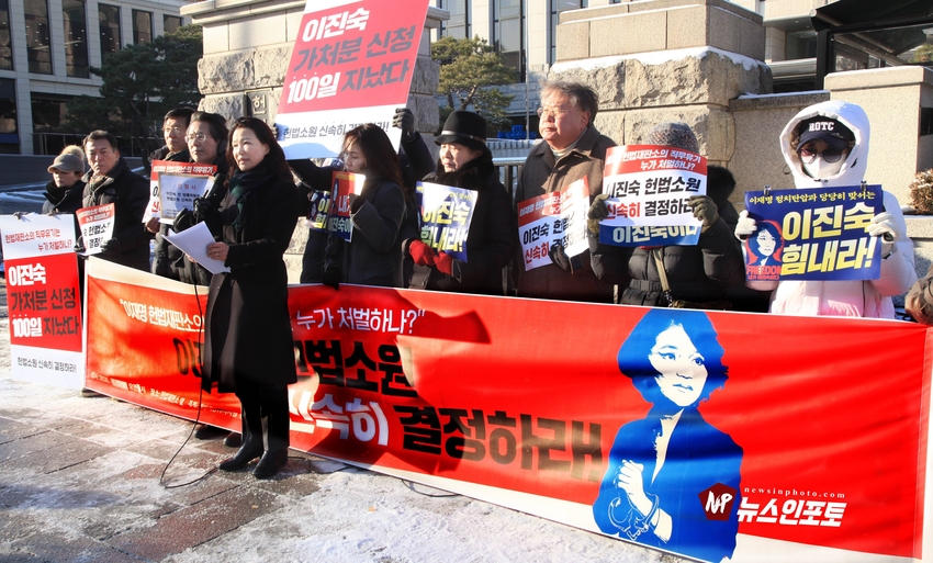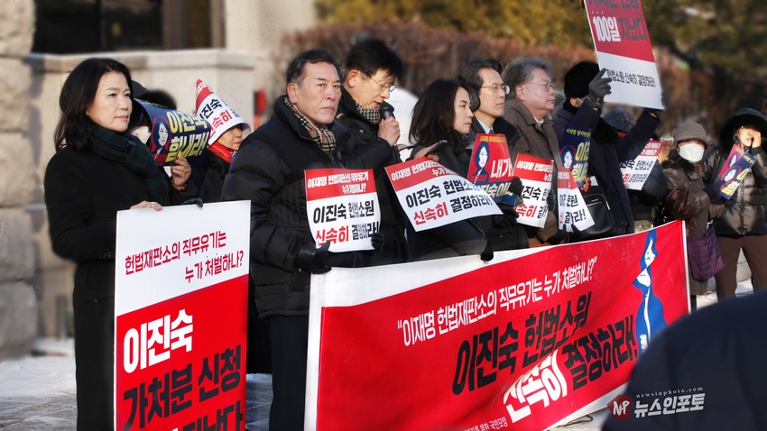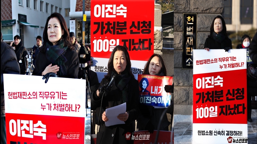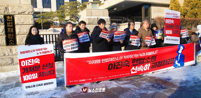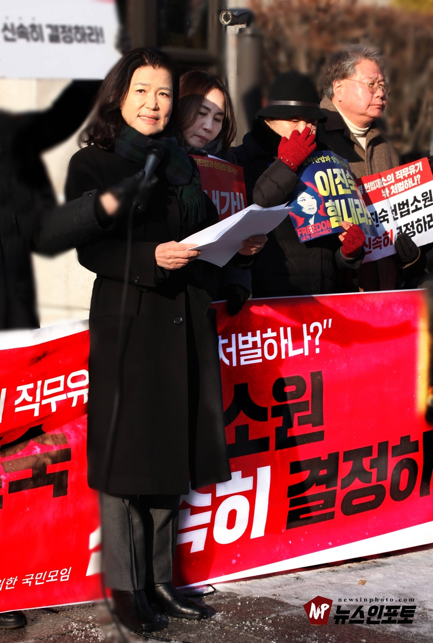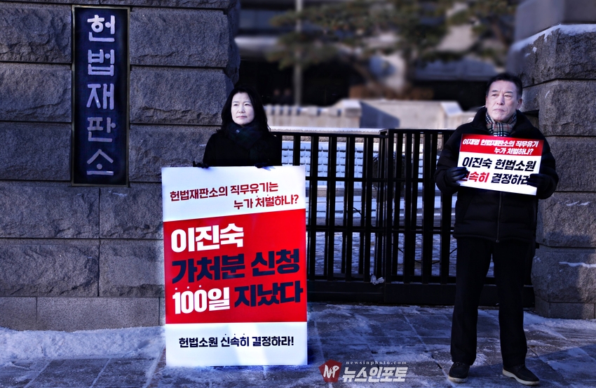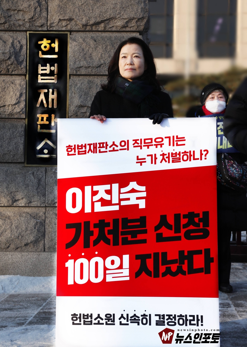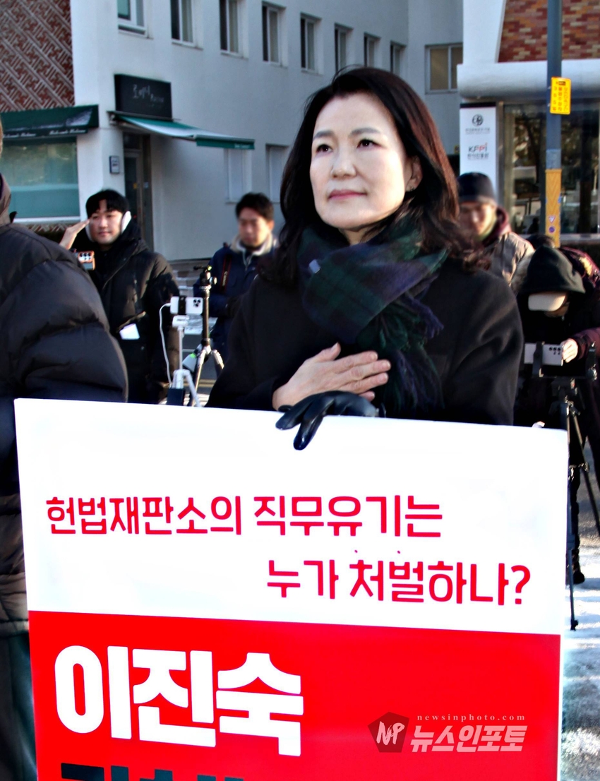 [뉴스인포토] 이진숙 전 방통위원장 헌재 앞 일인 시위, 기자회견.헌법재판소에 청구한 “가처분 신청 및 헌법소원심판” 100일 넘도록 뭉개고 있는 김상환 헌법재판소장과 헌법재판관들 규탄 시위.일인 시위 12일부터 16일까지 추위속 진행 .대한민국 국민들 목소리 내 주지 않으면 대한민국 민주주의 죽습니다.대한민국 법치도 함께 죽습니다.ㅡㅡㅡㅡㅡㅡㅡㅡ20260113, 화요일 오전 9시. 헌법재판소 앞. 기자회견. 일인시위.이진숙 전 방통위원장. 방송미디어통신저지를위한국민모임 등 10개 단체.ㅡㅡㅡㅡㅡㅡㅡㅡ( 뉴스인포토닷컴 사진.글= 주동식 사진전문기자) 이진숙 전 방송 통신 위원장은 자신이 헌법재판소에 청구한 “ 가처분 신청 및 헌법소원심판”을 100일 넘도록 뭉개고 있는 김상환 헌법재판소장과 헌법재판관들을 규탄하는 일인 시위를 지난 1월 12일부터 헌법재판소 앞에서 오전 8시 30분부터 9시 30분까지 진행하고 있다. 일인 시위 둘째 날인 13일 화요일에는 일인 시위 진행 중, 시민단체 방송미디어통신위원회저지를위한국민 모임(이하 “방미통위저지모임”) 10개 단체와 회원들이 “헌재는 이진숙 방통위원장 재기 헌법소원 심판 신속히 결정하라!”는 제목의 기자회견을 1