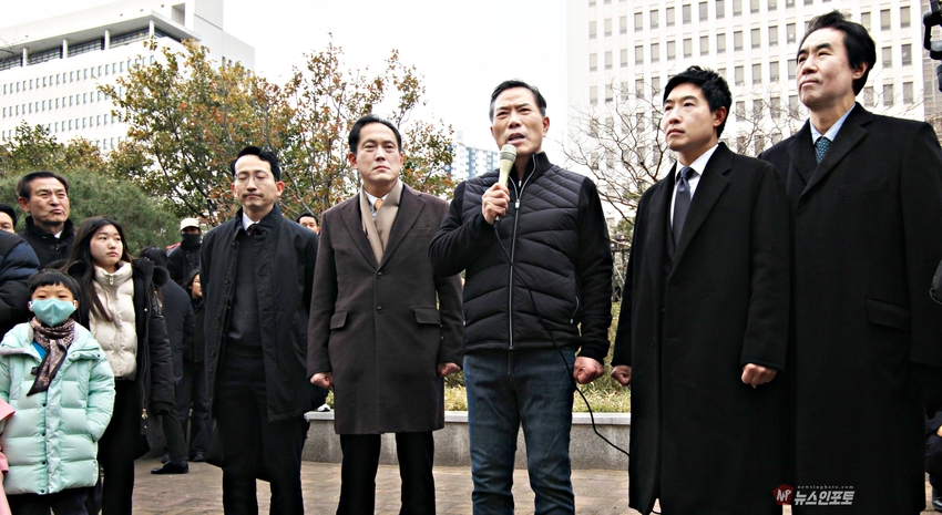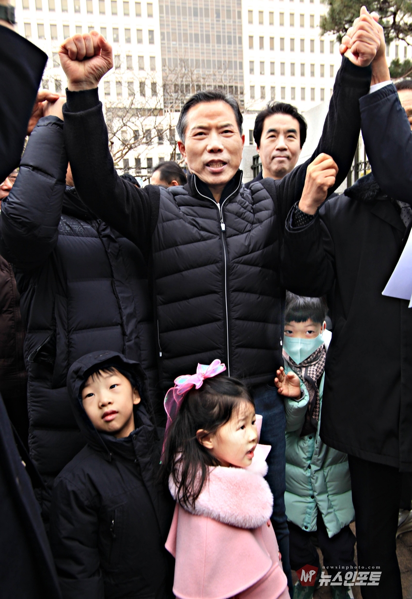 손자 손녀 손을 잡고 두 아들의 안내받으며  법원 영내를 걸어 나오면서 구속 5개월 만에 국민과 언론에 모습을 드러낸 손현보 목사는 다소 건강 모습으로 바로 부산지방법원 정문 앞에서 진행된 기자회견에서 변호인들과 함께 자신의 입장을 밝혔다.