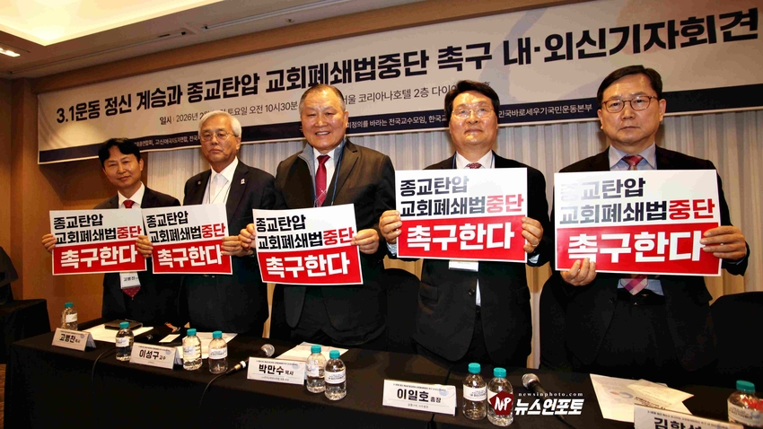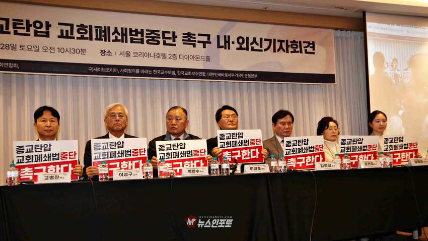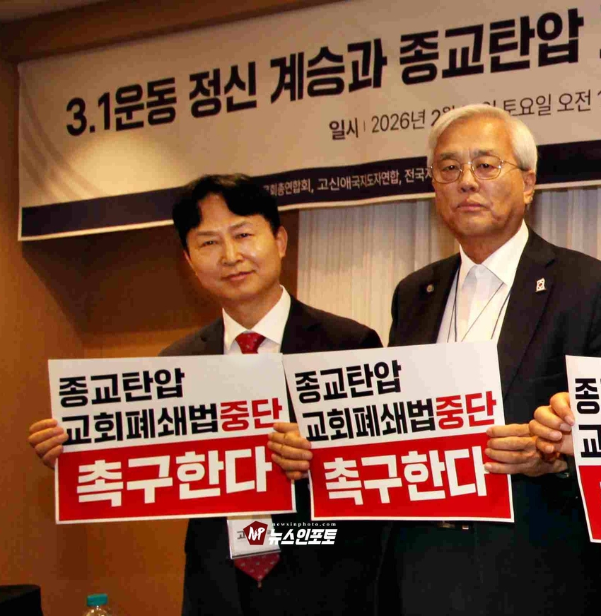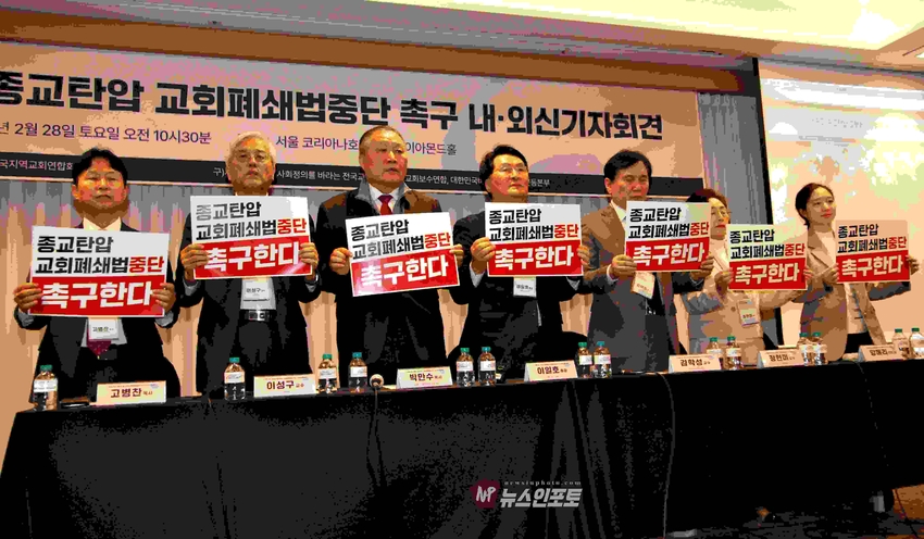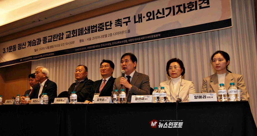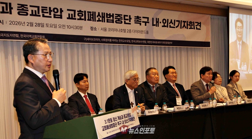 [뉴스인포토닷컴] 3.1운동 정신 계승과 종교 탄압 교회 폐쇄법 중단 촉구 내, 외신기자회견, ㅡㅡㅡ 광화문 전광훈 목사측, (구)세이브코리아 측 기독교 대표 세력 연대 투쟁, 합동 기자회견,ㅡㅡㅡㅡ전광훈 목사, 1심 내란 선전 선동 불송치 지적!! 구속 이유 없다,ㅡㅡㅡㅡ이재명 정권, 종교 자유 침해, 교회 폐쇄 악법 저항한다!,ㅡㅡㅡㅡ교회 탄압 입법 시도?, 종교 자유, 헌법적 가치, 강력 투쟁 이어간다!.ㅡㅡㅡㅡㅡㅡ202260228 오전 10시. 코리아나호텔 기자회견장. 대국본, (구)세이브코리아 지역 관계자, 한국장로회총연합회, 고신애국지도자연합, 전국지역교회연합회, 사회정의를 바라는 전국교수모임, 한국교회보수연합.ㅡㅡㅡㅡㅡㅡ뉴스인포토닷컴. 글.정리.사진=주동식 사진전문기자. 3.1절 107주년 하루 전 2월 28일 보수 성향 기독교 시민단체들이 모여 광화문 인근 코리아나 호텔 2층에서 내. 외신 기자회견을 열고 최근 발의된 민법 개정안 일명 교회폐쇄법 철회를 강력히 촉구했다. 이날 기자회견은 기독교 대형 집회를 주도해 온 대한민국바로세우기국민운동본부(대국본)와 (구)세이브코리아 지역 관계자, 한국장로회총연합회, 고신애국지도자연합, 전국지역교회연합회,