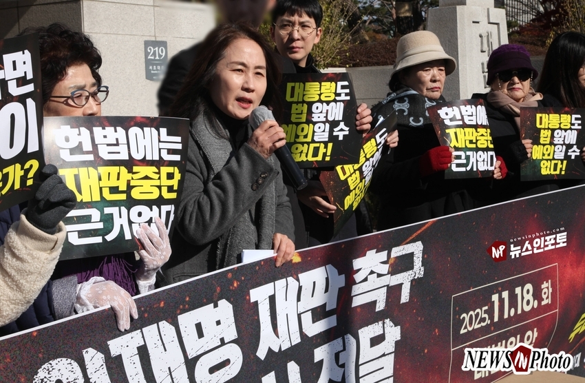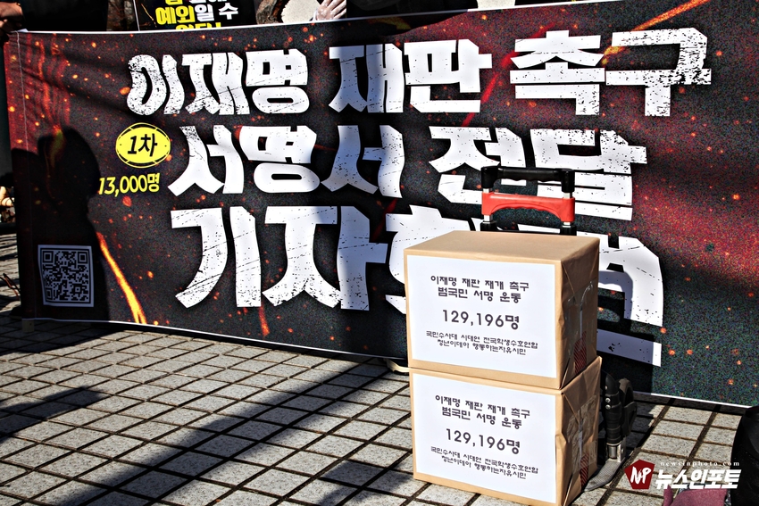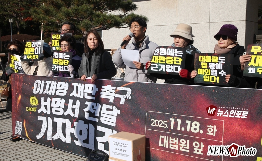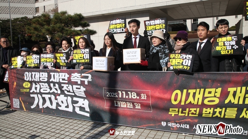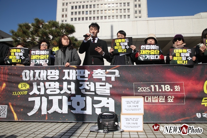 [뉴스인포토] 이재명 재판 재개 촉구 국민 서명 운동, 개시 4일만에 10만 명 참여!국민수사대 (대표 박소영) 1차 129,196명 명단, 18일 조희대 대법원에 전달 !,서울, 수도권 추가 현수막 게시, 전국적으로 확대 게시 돌입 .ㅡ 사법부는 권력이 아닌 국민을 믿고, 정의로운 재판을 다시 열어라!.ㅡ 정의를 바로 세워 대한민국의 심장을 다시 뛰게 만들어 주십시오!.ㅡ 국민이 여러분을 응원하며 함께 할 것입니다!.ㅡㅡㅡㅡㅡㅡㅡㅡㅡㅡ20251118. 서초동 대법원 앞, 국민수사대(대표 박소영)청년이데아, 시대연, 전국학생수호연합, 행동하는자유시민.ㅡㅡㅡㅡㅡㅡㅡㅡㅡㅡㅡ[시민독립언론 뉴스인포토닷컴 / 사진.정리 = 주동식 사진전문기자] 지난 달 10월 31일 국회소통관에서 국민수사대와 청년이데아 시대연 전국학생수호연합 행동하는자유시민 등 시민단체가 함께 이재명 재판 재개 촉구 범국민 서명 운동 개시 나흘 만에 10만 명이 서명에 참여해 시민단체 국민수사대는 어제 11월 18일 대법원에서 기자회견을 갖고 1차 서명자 129,196명 명단을 조희대 대법원장에게 전달했다. 청년이데아 이상운 대표는 대통령이 되면 그 어떤 범죄도 7,000억이 넘는 범죄도 묻을 수